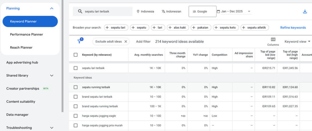 Gunakan bantuan tools seperti Google Keyword Planner untuk melihat volume pencarian. Jangan cuma incar kata kunci pendek (misal: “Sepatu”). Persaingannya bakal berdarah-darah! Coba bidik long-tail keywords yang lebih spesifik (misal: “Sepatu lari lokal terbaik untuk kaki lebar”). Persaingannya biasanya lebih rendah, tapi orang yang nyari sudah punya niat yang lebih jelas untuk membaca atau membeli.