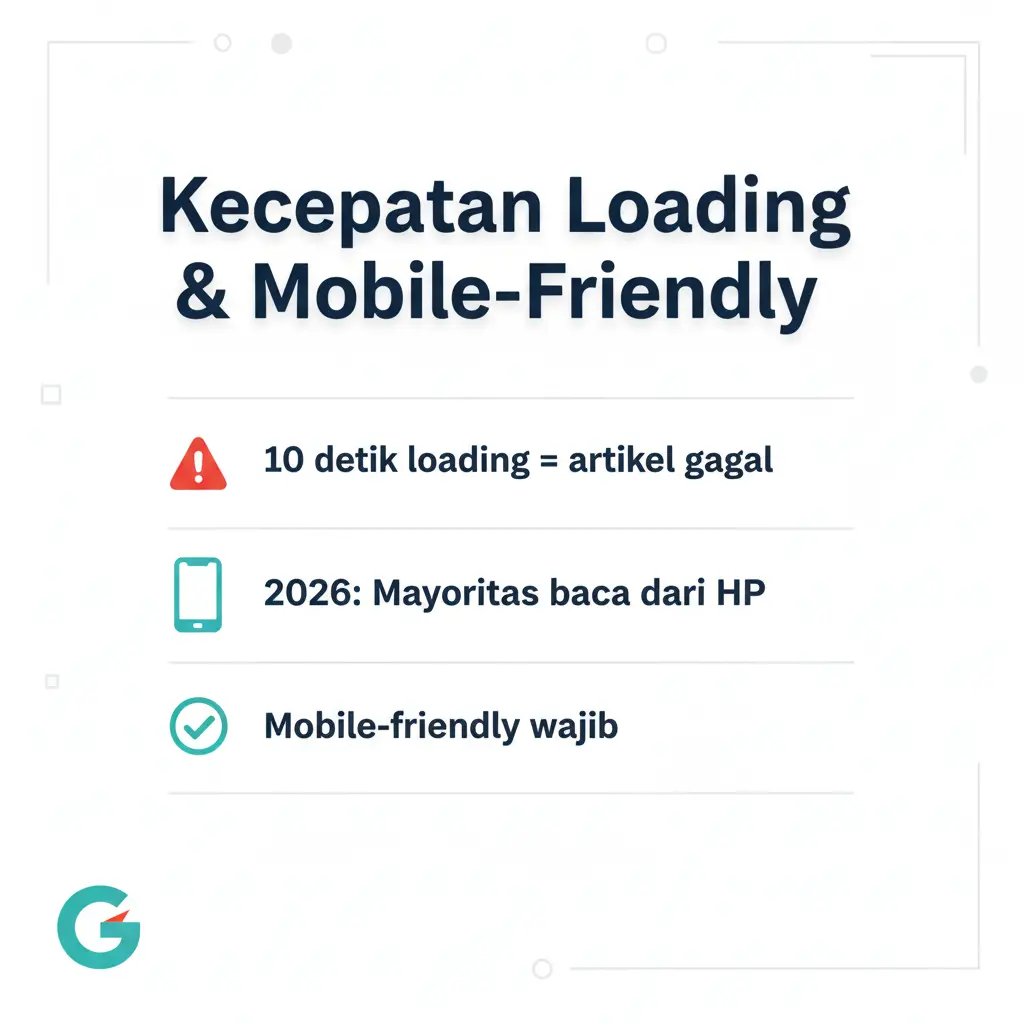 Percuma artikelmu setingkat pemenang Pulitzer kalau pas dibuka loadingnya 10 detik. Di tahun 2026, mayoritas orang baca dari HP sambil nunggu kopi atau di kereta. Pastikan websitemu mobile-friendly dan ringan. Kamu bisa cek performa websitemu di Google PageSpeed Insights.