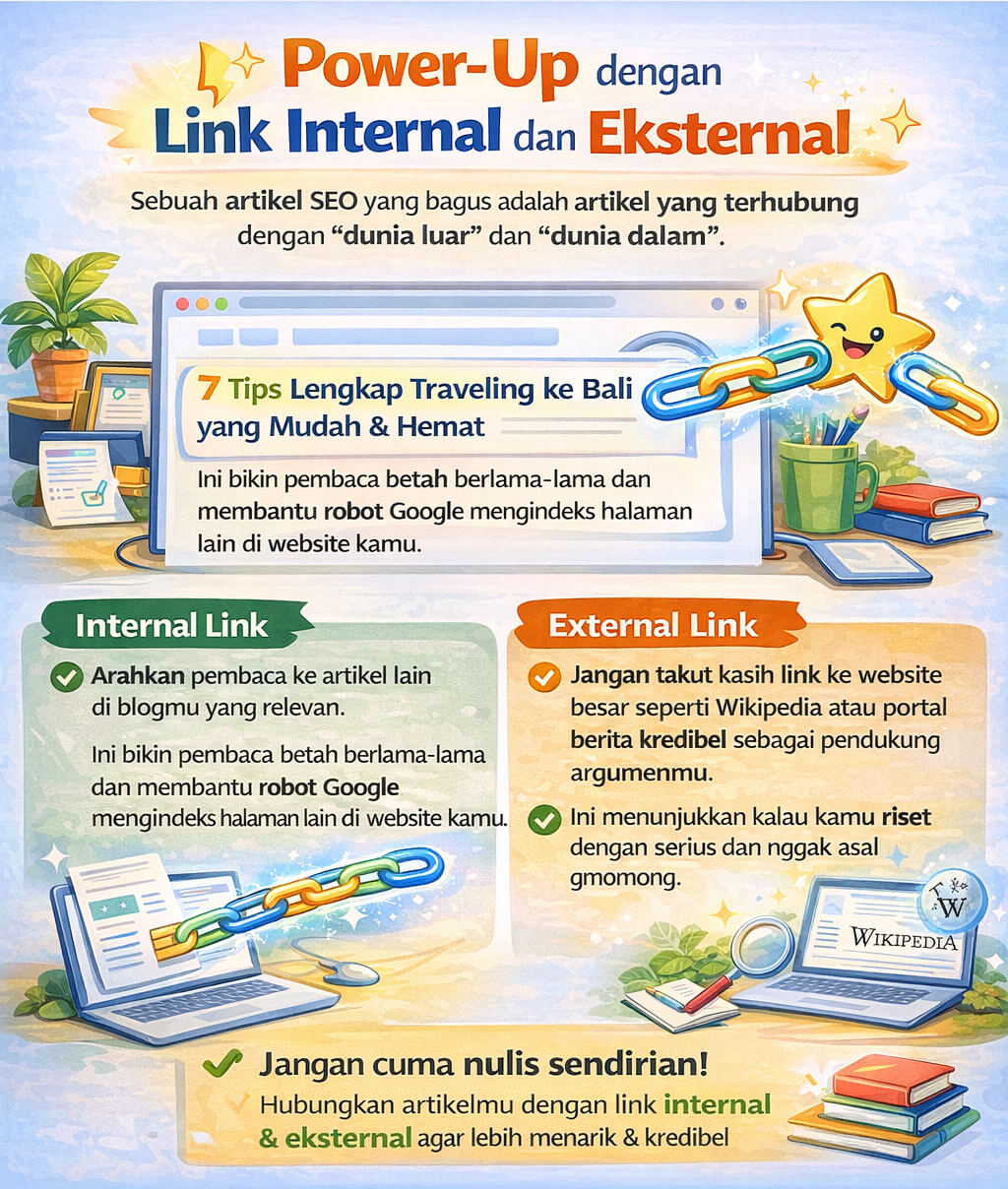 • Internal Link: Arahkan pembaca ke artikel lain di blogmu yang relevan. Ini bikin pembaca betah berlama-lama dan membantu robot Google mengindeks halaman lain di website kamu.