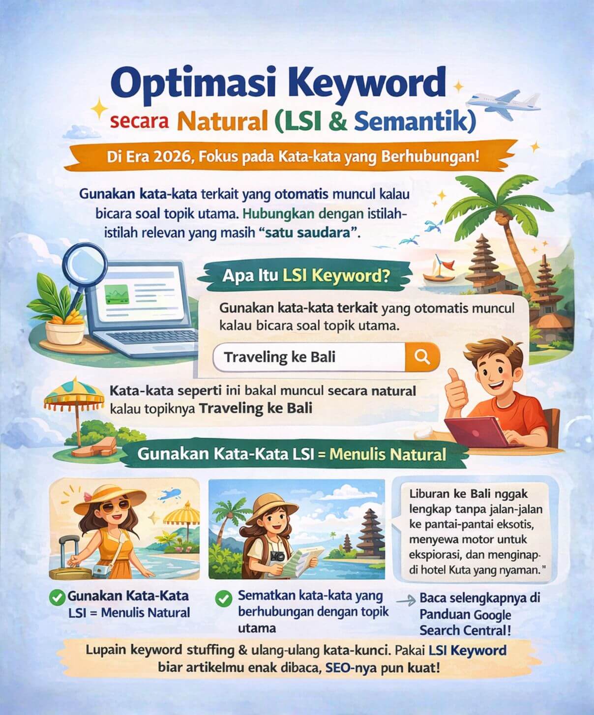 Artinya, gunakan kata-kata yang masih “saudara” atau berhubungan dengan topik utama. Kalau topikmu adalah “Traveling ke Bali”, maka kata-kata seperti “tiket pesawat”, “hotel di Kuta”, “pantai”, dan “sewa motor” harus muncul secara natural. Google cukup pintar untuk mengerti konteks artikelmu tanpa kamu harus mengulang-ulang kata kunci yang sama sampai muntah.