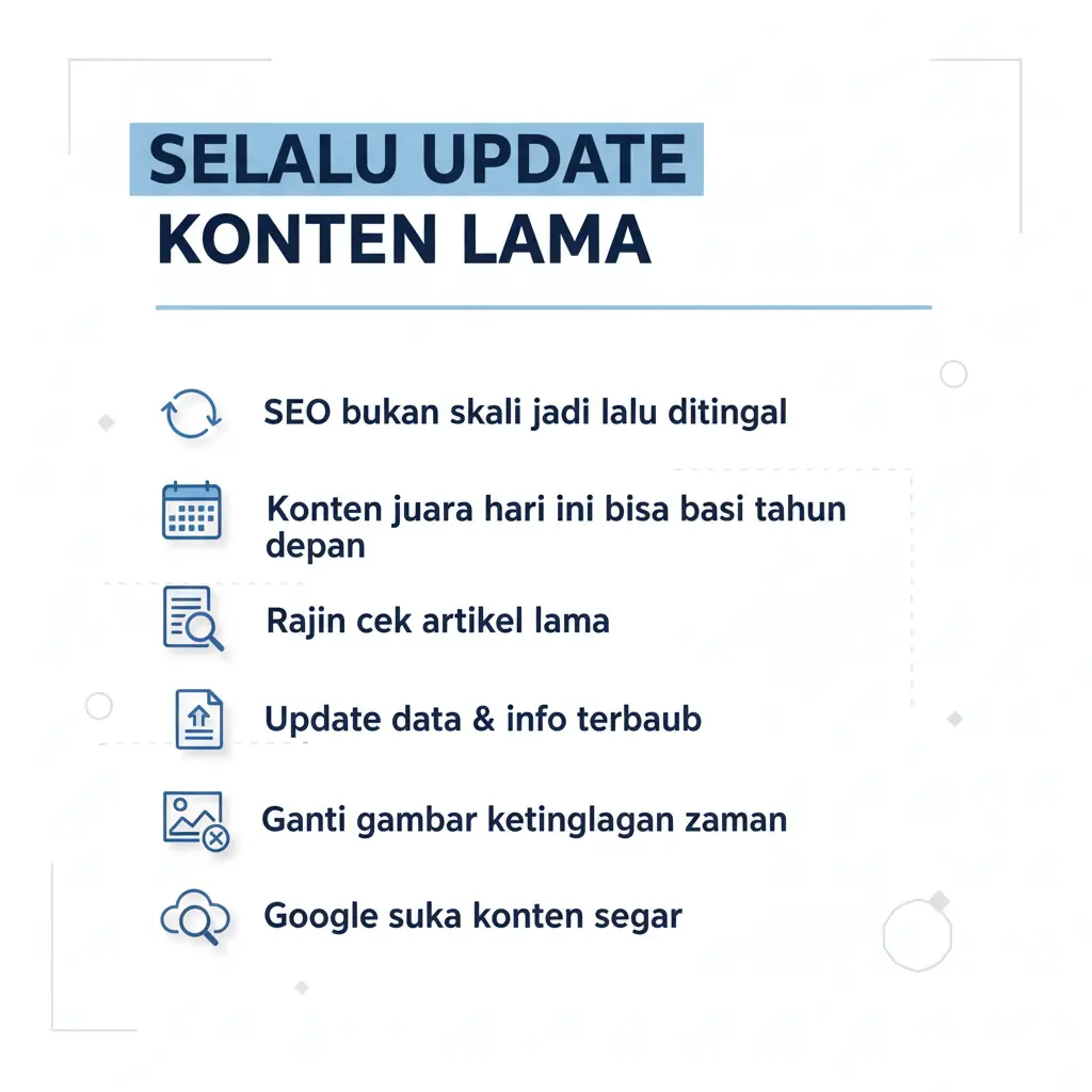 SEO itu bukan kerjaan “sekali jadi terus ditinggal tidur”. Konten yang juara hari ini bisa saja basi tahun depan. Rajin-rajinlah melihat artikel lamamu. Update datanya, tambah info terbaru, atau ganti gambar yang sudah ketinggalan zaman. Google sangat suka website yang kontennya selalu segar.